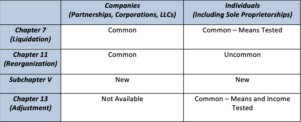 Below is a brief summary of some the most common alternatives for “companies” (which includes partnerships, corporations, and LLCs; but does not include sole proprietorships) and for “individuals” (including sole proprietorships). A sole proprietorship is a business that is owned and operated by one person and is legally indistinguishable from its owner. As a result, the owner of a sole proprietorship is personally liable for the debts of the business. Because many small businesses are sole proprietorships, this summary touches on many aspects of individual bankruptcy as well. One issue worth mentioning up front is that with all bankruptcies, by law, an automatic stay immediately goes into effect, stopping any effort by creditors to pursue litigation against the debtor, recover assets from the debtor (or garnish wages) or otherwise execute on judgments that may have already been obtained.